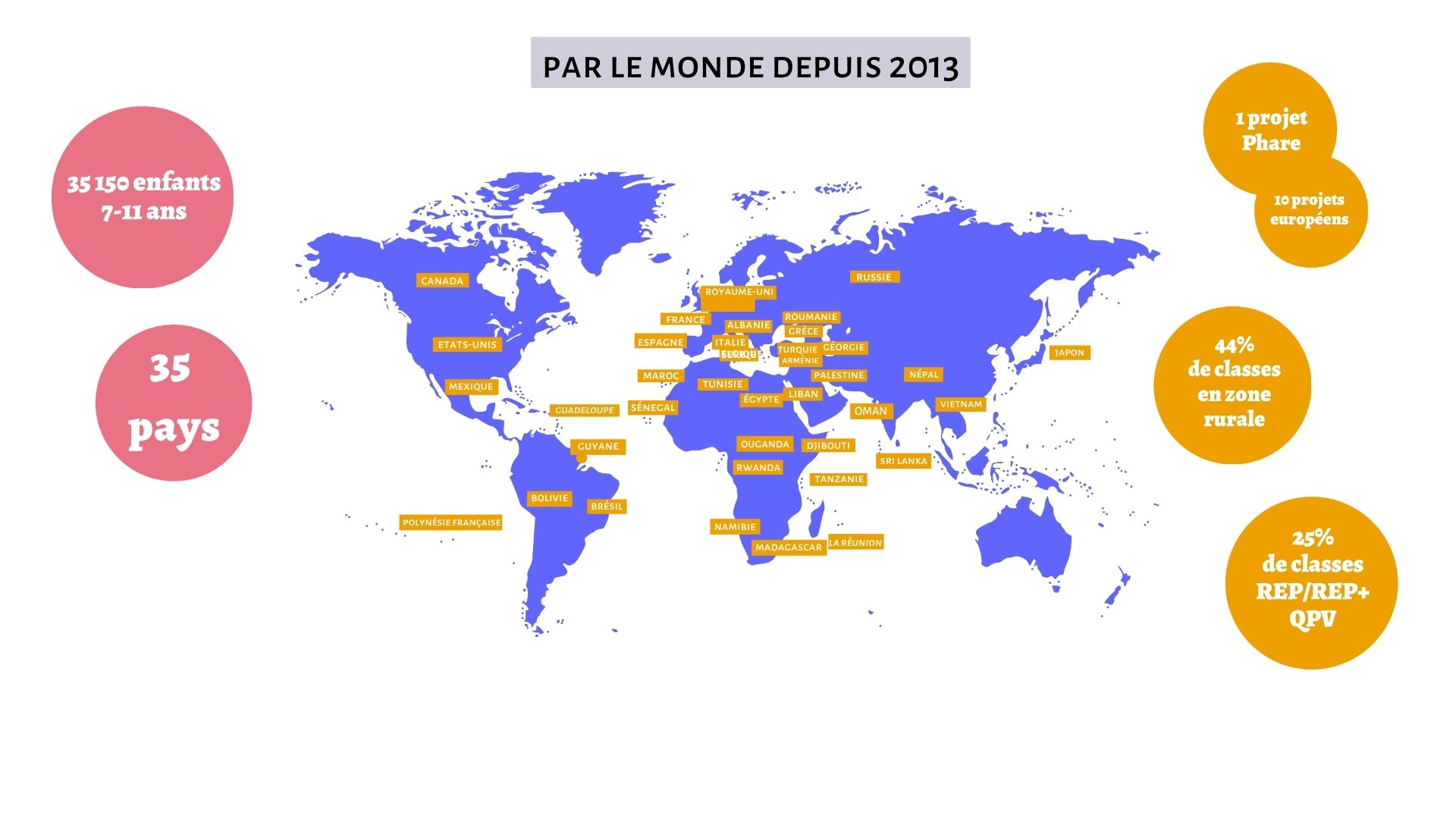 En cinq ans, 800 classes de 51 pays du monde (Arménie, Belgique, Canada, France, Liban, Roumanie, Russie, Maroc, Rwanda, Sri Lanka, Palestine, …) ont participé à des échanges en ligne, centrés sur leurs cultures et leurs quotidiens !